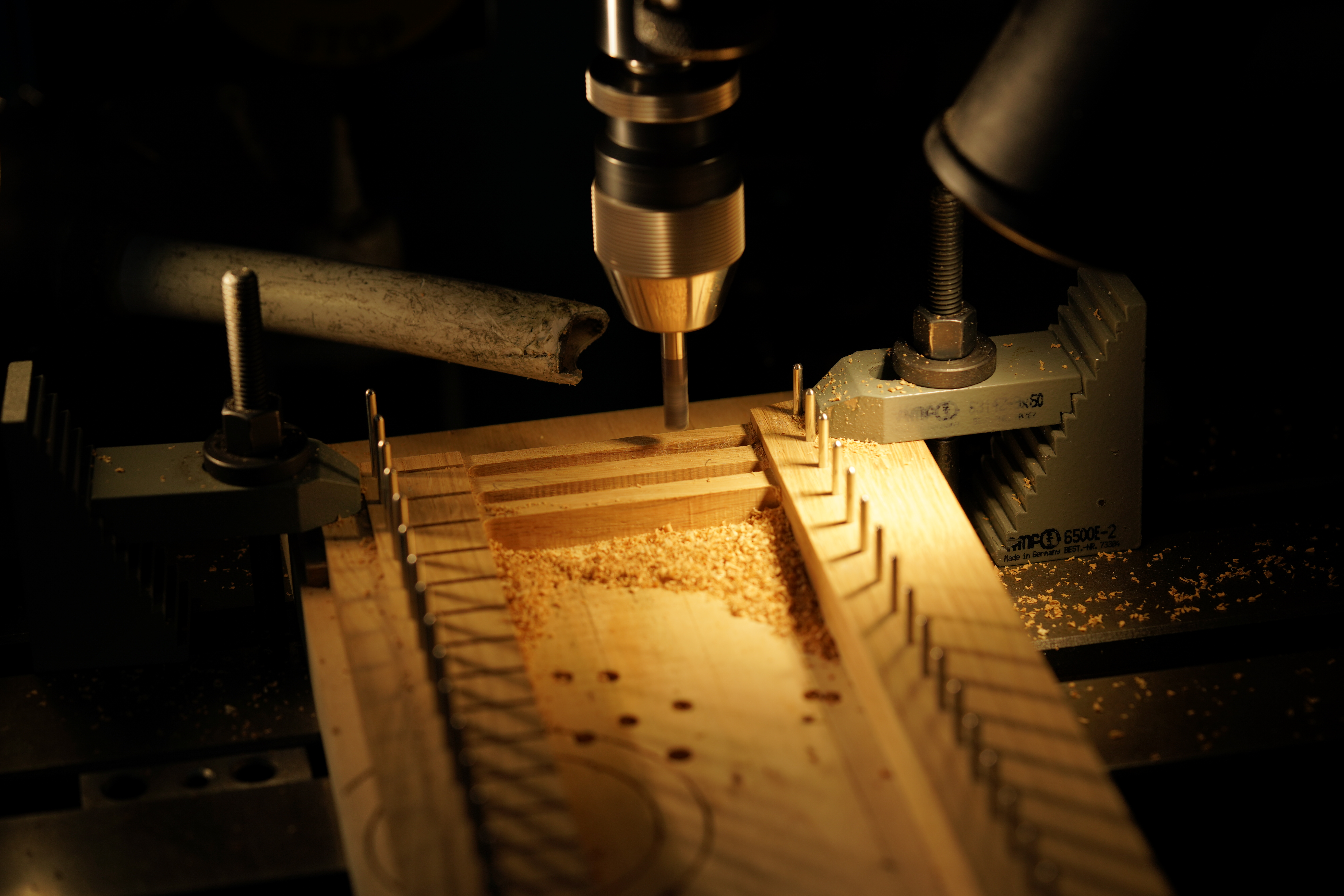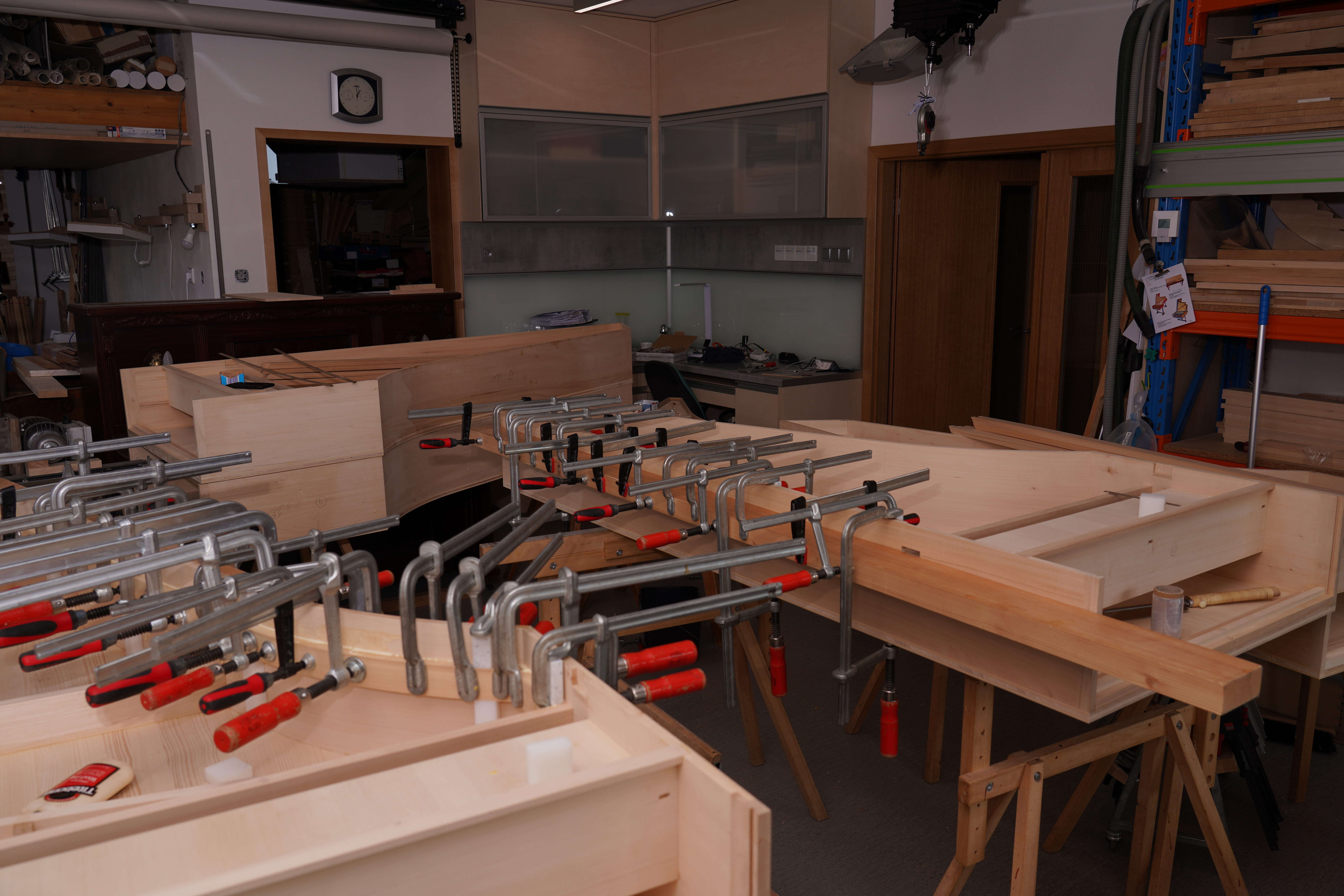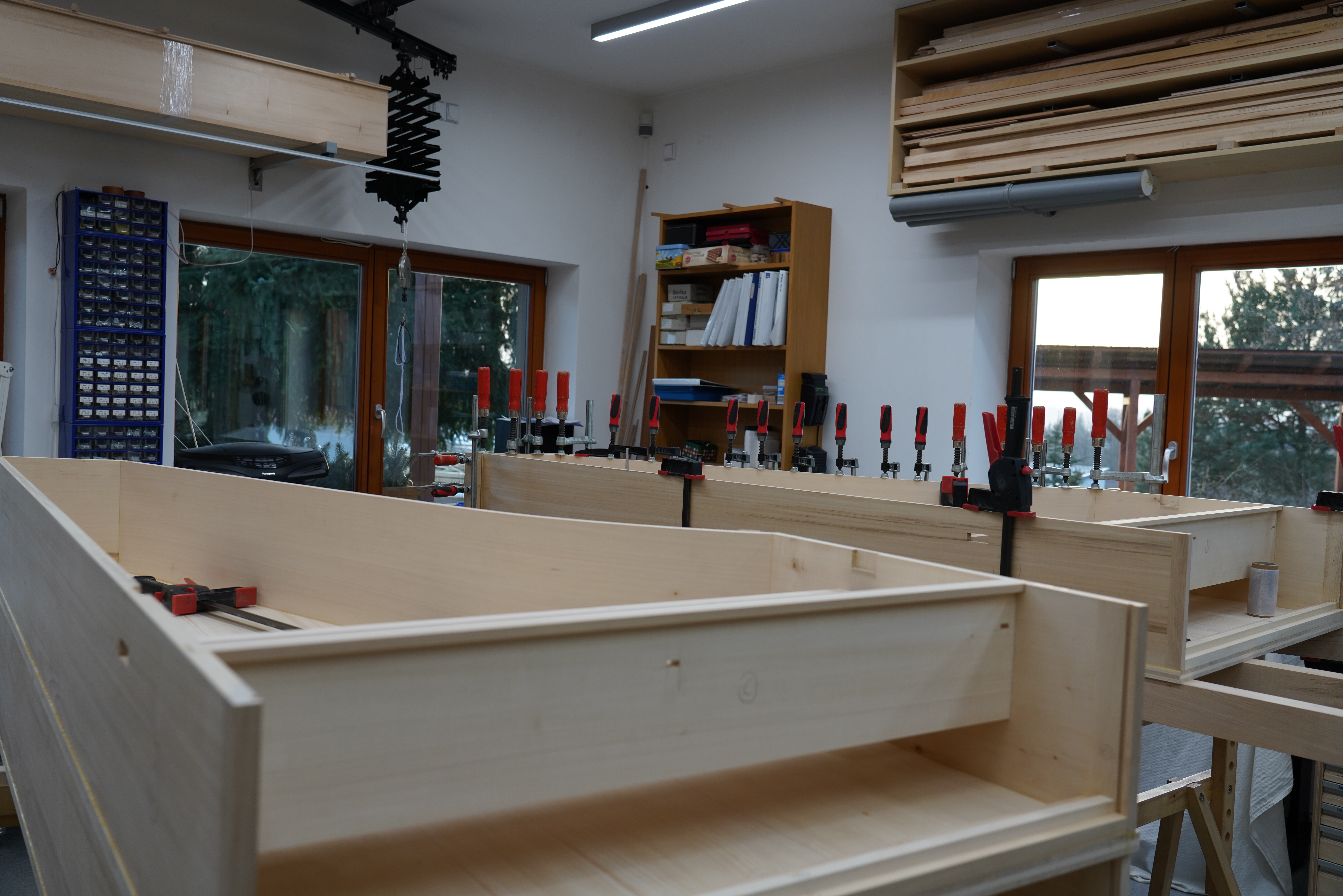 We build instruments in a workshop with controlled climate conditions, which ensures stable temperature and humidity. Every buiding of new instrument begins with the preparation of the materials. The wood undergoes a multi-stage drying process and long-term acclimatization to attain the required dimensional and shape stability. This method of material preparation and the climatic conditions in which the instrument is constructed are the key for reliable instrument construction and tuning stability.