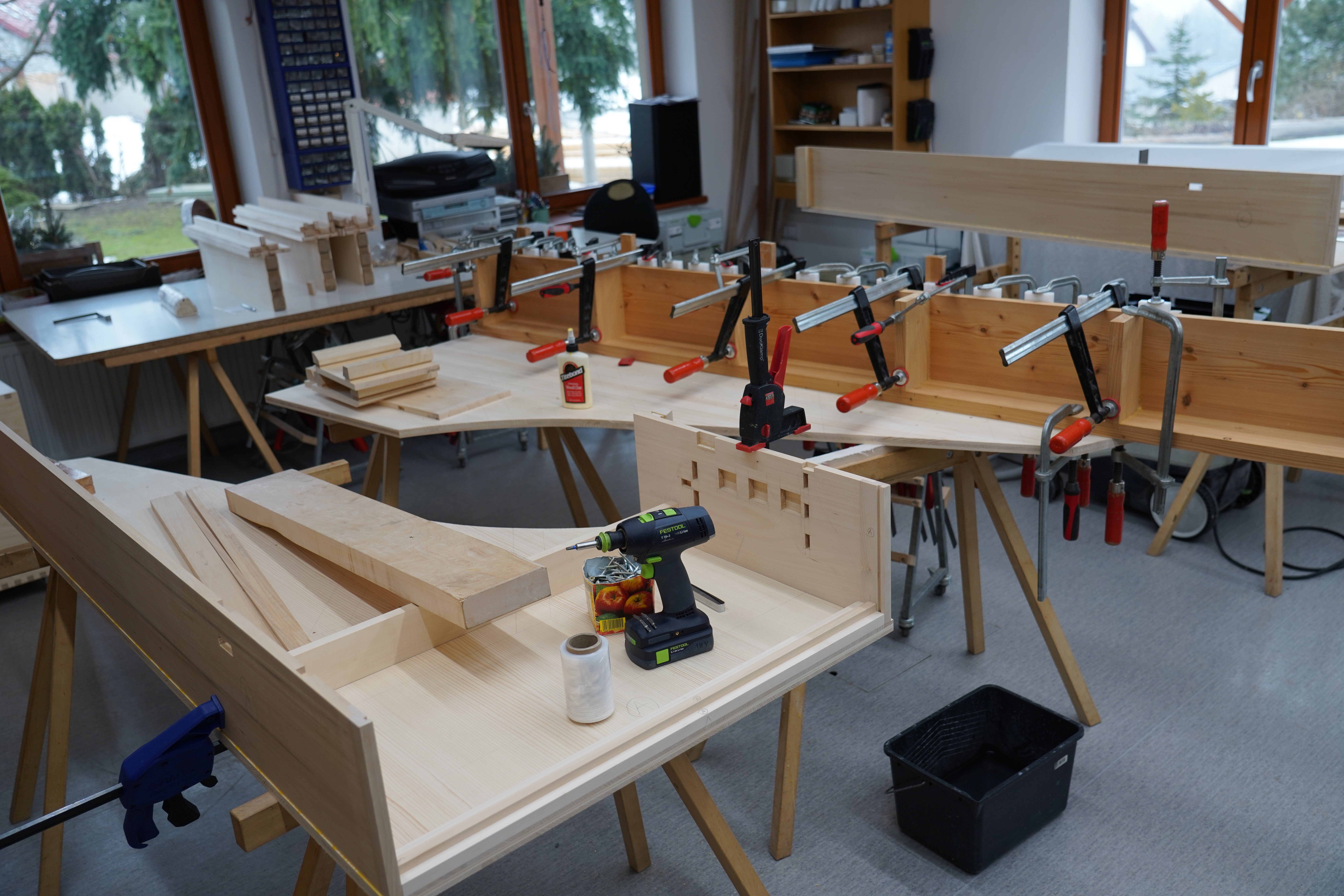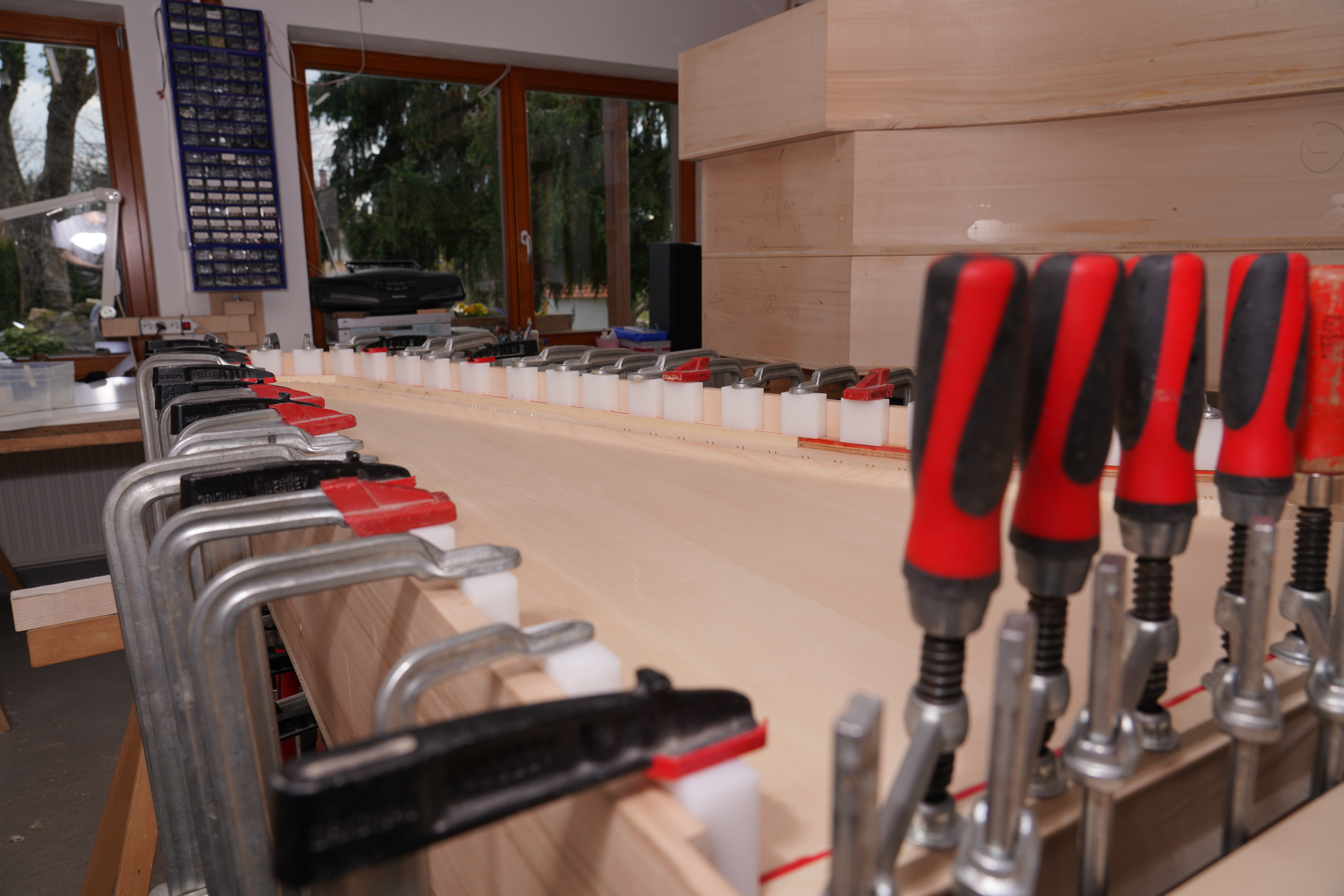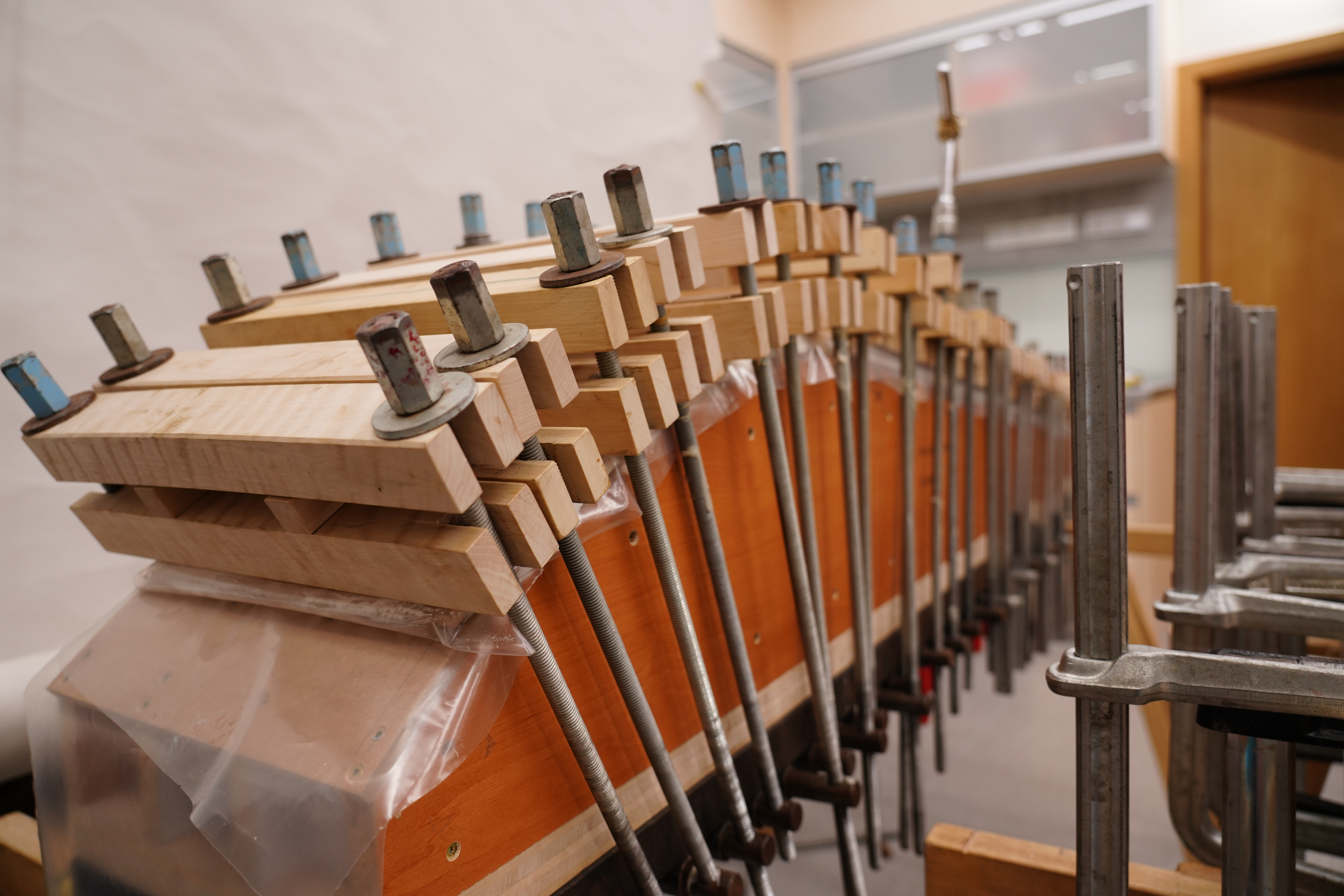 We build instruments in a workshop with controlled climate conditions, which ensures stable temperature and humidity. Every buiding of new instrument begins with the preparation of the materials. The wood undergoes a multi-stage drying process and long-term acclimatization to attain the required dimensional and shape stability. This method of material preparation and the climatic conditions in which the instrument is constructed are the key for reliable instrument construction and tuning stability.